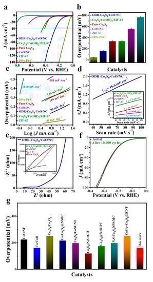 (a) HER performance, (b) Overpotential comparison (The error bar represents the range of results from three independent measurements). (c) Tafel slope of ODR-Co9S8/CoO/NC, 20% Pt/C, Co3S4/Co(OH)2/ZIF-67, ZIF-67, Co9S8, and CoO/NC in 0.1 M KOH. (d) Capacitive current measurements (ΔJ0 = Ja − Jc) and (e) Nyquist plots for ODR-Co9S8/CoO/NC, Co3S4/Co(OH)2/ZIF-67, ZIF-67, Co9S8 and CoO/NC. (f) Durability of ODR-Co9S8/CoO/NC electrocatalyst after first and 10,000th CV cycles. (g) Overpotential comparison of the as-prepared catalyst with previously reported Co-based compounds at JHER = 10 mA cm−2.