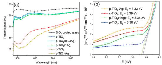 (a) Transmittance spectra of the SiO2 coated glass substrate, the different TiO2 coatings and the TiO2–Ag composite coatings on the example of p-TiO2 type samples; (b) Tauc plots of samples prepared on quartz glass.