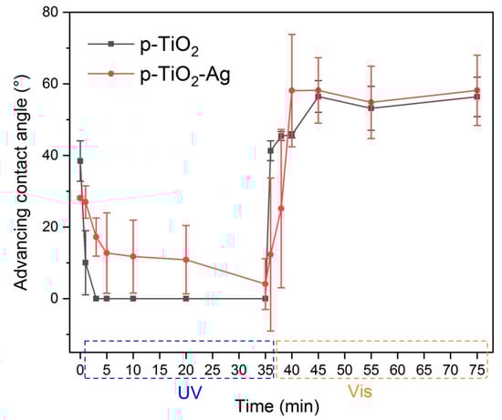The surface wettability of the coatings was investigated by measuring advancing and receding contact angles of distilled water. Contact angles were measured before and after irradiation with UV or visible light, in order to investigate the photoinduced changes in the wetting properties. The measured values, and the determined hysteresis and Young’s contact angle values can be seen in Table S2 in Supporting Information. All samples were hydrophilic, and the measured contact angles changed depending on environmental changes: as-prepared samples showed contact angles below 30°, and this value increased the longer the samples were kept in dark. As a result of UV irradiation the surface became more hydrophilic and contact angles decreased to zero or nearly zero for all samples. After keeping the samples in darkness or under visible light, higher contact angle values of 50–70° could be reached. Most samples behaved similarly with only slight differences, with the exception of p-TiO2–Ag samples, which showed generally higher contact angle values, and became less hydrophilic under UV light compared to the other samples. In Figure 3 it can be seen that p-TiO2–Ag samples needed much longer UV irradiation time to reach low contact angle values compared to p-TiO2 coatings, and even 35 min was not enough to reach complete wetting on the whole surface. Regeneration under visible light also happened slightly slower.