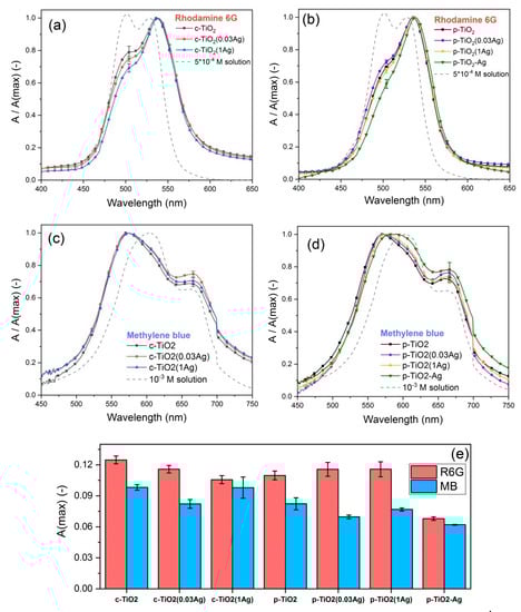 The normalized absorbance spectra of R6G dye impregnated samples (seen in Figure 4a,b) show a peak around 536 nm, which can be attributed to the monomer molecules, while the smaller peak around 505 nm can be attributed to the H-dimers [37]. The c-TiO2 type coatings contain more dimer molecules compared to the p-TiO2 type coatings, due to the differences in pore sizes. Generally, the addition of silver into the pore structure led to a lower amount of dimers present in the dye impregnated coatings. The normalized absorbance spectra of methylene blue dye impregnated coatings (Figure 4c,d) show a monomer peak around 660 nm, while associated forms of the dye (dimers and higher associates) have absorbance in the lower wavelength region between 560–610 nm: the highest peak around 573 nm can be attributed to the trimer form [38]. The p-TiO2–Ag coatings contain significantly less dye molecules in trimer form, and these are the only coatings where the MB dimers show an easily observed peak (at 605 nm [38]), that can also be seen on the spectra of the impregnating solution.