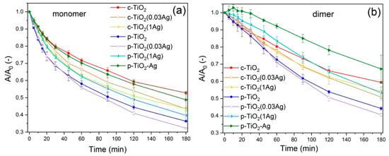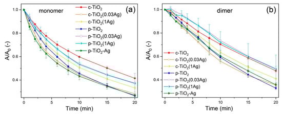 Similarly to our previous findings [18], the monomer degradation was found to be significantly faster than the dimer degradation, especially in the initial part of the degradation process. The p-TiO2 coatings showed higher photoactivity than c-TiO2 coatings. Both c-TiO2(0.03Ag) and c-TiO2(1Ag) samples show increased photodegradation compared to c-TiO2 samples. In contrast, p-TiO2(0.03Ag) and p-TiO2(1Ag) samples show lower photodegradation rates than p-TiO2 samples. However, p-TiO2–Ag samples showed the highest photodegradation rates out of all samples, especially in the first interval of the degradation.