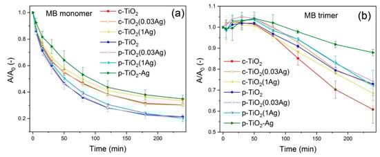MB shows a much slower degradation under UV light than R6G. Furthermore, no dye degradation was observed under visible light, which means that the MB dye was not capable of sensitizing the TiO2 photocatalysts. A/A0 − t curves of MB photodegradation under UV light can be seen in Figure 7. The photodegradation starts with the quick decrease of the small monomer peak, while the trimer peak increases, showing that the monomer photostability is much lower than that of the associated form, and also that trimerization occurs in the samples during the UV irradiation.