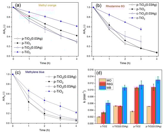 Dye photodegradation under UV light at the liquid–solid interface was measured on c-TiO2, c-TiO2(0.03Ag), p-TiO2 and p-TiO2(0.03Ag) samples, using 10−5 M aqueous solution of R6G, MB and MO dyes (Figure 8a–c). Kinetics could be described by pseudo-first order model, and the k values were determined (Figure 8d). Significantly faster dye degradation was observed in the presence of p-TiO2 coatings compared to c-TiO2 coatings. The c-TiO2 samples showed higher photoactivity after AgNO3 impregnation for all the investigated dyes. The difference was smaller in the case of p-TiO2 samples, where the Ag modified coatings showed higher photoactivity for MO degradation, but only a slight increase could be observed for R6G and MB degradation. These results are in good agreement with the detailed study of photodegradation at the air–solid interface, described above.