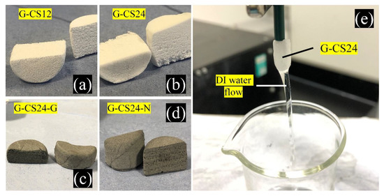 The appearance of the PCL/CS porous monoliths: (a) G-CS12; (b) G-CS24; (c) G-CS24-G; (d) G-CS24-N; and (e) the water flushing on the G-CS24 monolith.