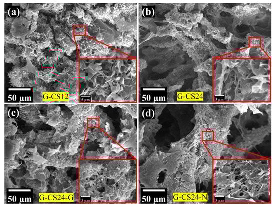 The microstructure of the PCL/CS porous monoliths: (a) G-CS12; (b) G-CS24; (c) G-CS24-G; (d) G-CS24-N.