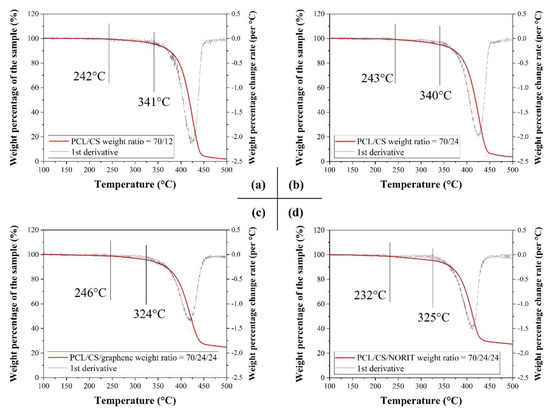The TGA curves of the PCL/CS porous monoliths: (a) G-CS12; (b) G-CS24; (c) G-CS24-G; (d) G-CS24-N.