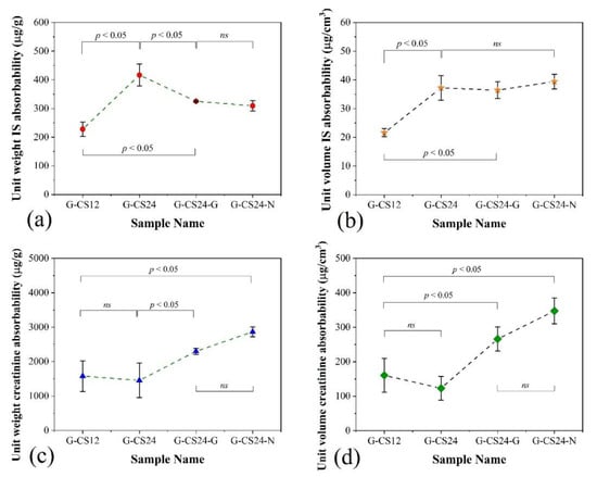 The absorbability on creatinine and albumin-bound IS of the PCL/CS porous monoliths were tested and normalised with the weight and volume of the monoliths for comparison (Figure 8). The G-CS24 (PCL/CS weight ratio = 70/24) without carbon additives was found to have the best unit weight IS absorbability of all the PCL/CS porous monoliths (Figure 8a,b), while the unit volume IS absorbability of all CS24 porous monoliths had no significant difference, which indicated that the addition of porous carbon particles could not improve the albumin-bound IS absorption performance of the PCL/CS porous monolith, and the additional weight from these carbon particles would reduce the unit IS absorbability of the PCL/CS porous monoliths. On the other hand, carbon containing samples (G-CS24-G and G-CS24-N) had higher unit creatinine absorbability than the chitosan only samples (G-CS12 and G-CS24), indicating that the addition of porous carbon could enhance the creatinine absorption of the PCL/CS porous monoliths, while increasing the chitosan content in the composition failed to improve the creatinine absorption of the monoliths when comparing the unit creatinine absorbability of G-CS12 and G-CS24 samples (Figure 8a,b).