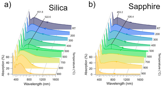 Figure 3a,b show the optical absorption spectra as a function of the annealing temperature of the films deposited on silica and sapphire, respectively. The data are strikingly similar for the two substrates up to 600 °C. The steep increase located between 320 and 360 nm is due to TiO2 interband transitions. The RT spectrum broad absorption band, centered at 451.8 ± 0.8 nm on silicon and at 453.2 ± 0.8 nm on sapphire, has been observed in other Ag/TiO2 nanocomposite thin films [42,52] and attributed to the surface plasmon absorption of the Ag NPs, having a radius of 5–9 nm. It also worth noting that the spectrum shape is very similar to that obtained for small (1.5–3 nm) Ag/TiO2 core-shell NPs in solution [71].