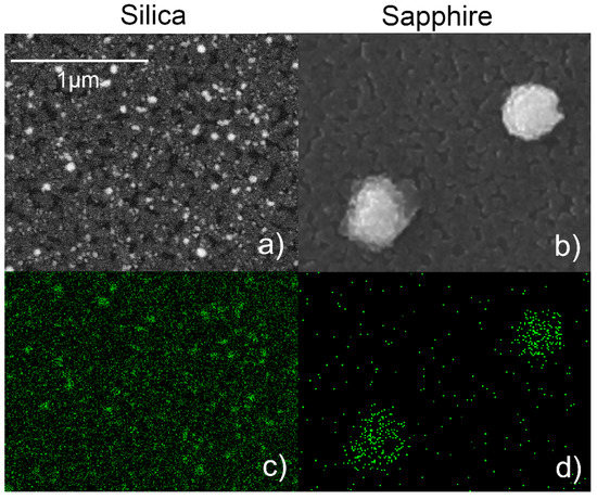 The Ag amount and distribution at the end of the annealing process were investigated via SEM and EDX. Figure 4a,b show the SEM images taken after annealing at 900 °C for 1h on the films deposited on silica and sapphire, respectively, while Figure 4c,d show the corresponding Ag EDX maps. On the sapphire deposited substrate, Ag islands of 570 ± 12 nm average width are present, while no Ag signal is detected elsewhere, confirming the hypothesis of Ag diffusion through the TiO2 matrix that leads to the aggregation of the metal on the surface of the TiO2 film. The total mass of the clusters, as calculated via AFM data, is equal to 78 ± 8% of the initial mass of Ag, meaning that a significant portion of the Ag atoms have been dispersed during annealing.