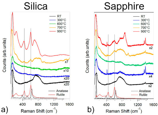 In order to investigate the evolution of the crystalline phase of TiO2, we acquired the vibrational spectra of Ag/TiO2 films via Raman spectroscopy after every annealing step. Figure 5a,b show Raman spectra of the Ag/TiO2 films on sapphire and silica for selected temperatures, respectively. At RT, the absence of the characteristic anatase and rutile Raman peaks indicate that the films are amorphous, as previously observed [85]. The weak band located at 150 cm-1 is commonly observed in the Raman spectra of silver oxides [86,87].