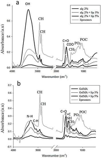 Surface analysis by FTIR of (a) alginate and (b) GelMA before and after functionalization with liposomes (3% and 5% (w/v)).