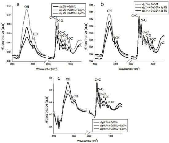 Surface analysis by FTIR of the mixture of GelMA and alginate with different concentrations of alginate. (a) Spectra of the mixtures with 2% (m/v) alginate, (b) spectra of the mixtures with 1% (m/v) alginate, and (c) spectra of the mixtures with 0.5% (m/v) alginate.