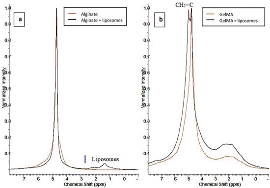 1H-NMR was used to determine the structure of hydrogels’ molecules by applying a nuclear magnetic resonance in NMR spectroscopy with respect to the 1H nuclei. Figure 3a shows the results of 1H-NMR obtained for alginate hydrogels, with and without nanoliposomes. These results present an interaction between the alginate polymer and the nanoliposomes, confirming the FTIR analysis. The spectrum shows a broad peak at 4.6–4.8 ppm representing the alginate polymer and the D2O solution in which it is solubilized. After the addition of liposomes, this peak does not change, while a new peak attributed to the liposomes appears at 1.35 ppm.