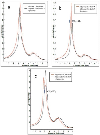 1HNMR spectra of the mixture between GelMA and alginate at different concentrations of alginate with and without nanoliposomes: (a) mixture with 2% alginate, (b) mixture with 1% alginate, and (c) mixture with 0.5% alginate.