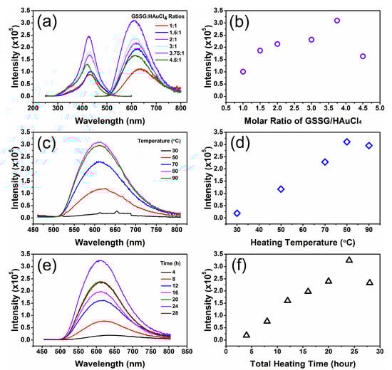 Optimization of the synthesis parameters. (a) Influence of the initial GSSG/HAuCl4 molar ratio on the excitation (left) and emission (right) of the GSSG–AuNCs; (b) variation of the emission maximum as a function of the GSSG/HAuCl4 molar ratio; (c) influence of the heating temperature on the emission spectra of the nanoclusters; (d) plot of emission intensities under different reaction temperatures; (e) effect of total heating time; and (f) dependence of emission intensity on the total reaction time. In the above experiments, the concentration of HAuCl4 was kept at 2 mM.