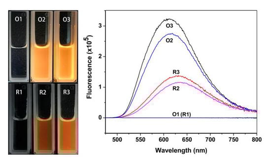 Photograph (left panel) and fluorescence emission spectra (right panel) of the AuNCs synthesized using GSH (denoted R) and GSSG (denoted O) as reducing and capping agents. Conditions: 1, reacting for 2 min at room temperature; 2, condition 1 first, then continuous heating at 80 °C for 24 h; 3, condition 1 first, then intermittent heating at 80 °C and at ambient temperature, alternately, each for 4 h, for a total time of 24 h. The photograph was taken under UV light at 365 nm. The synthesis conditions for R2 were adopted from the literature [35].