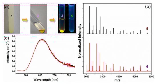 (a) Schematic illustration of the formation of the new phase and the enrichment of GSSG–AuNCs: (1) A turbid solution formed after mixing the GSSG–AuNC solution with acetonitrile; (2) a new phase formed at the bottom of the tube; (3) irradiation with 365 nm UV light; and (4) the upper acetonitrile-rich phase irradiated under the same conditions for comparison. (b) MALDI-TOF/TOF MS spectra of the GSSG-AuNCs before (5) and after (6) enrichment. (c) Photoluminescent spectra of the GSSG–AuNCs before (red line) and after (black line) enrichment.