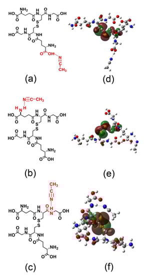 Hypothesized hydrogen bonds formed between acetonitrile and the GSSG functional groups: (a) carboxyl group, (b) amine group, and (c) amide group. (d–f) Corresponding frontier molecular orbitals of the charge transfers for (a–c).