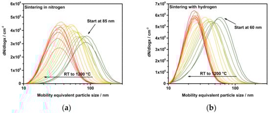 The first results on the sintering behavior of platinum particles under two different atmospheres are depicted in Figure 3. After admixing the reactive gases, the particles were introduced into the tube furnace, which was ramped up from room temperature (RT) to 1200 °C at 5 K/min. The subsequent Scanning Mobility Particle Sizer (SMPS) measured a particle size distribution every 90 s. It is important to emphasize here that the gases were added to the particles when their formation was completed, i.e., the primary particles had already aggregated and agglomerated. It is immediately apparent that already the first particle size distribution at room temperature with added hydrogen differs from pure nitrogen. The same behavior was observed with oxygenated process gas, which is included in Figure 4. For instance, the mode diameter decreased from 85 nm to 60 nm when hydrogen was added at room temperature. This decrease in size could not be reasoned by changes in the physical properties of the carrier gas such as different flow rates. For instance, the addition of hydrogen changed the flow rate through the CPC by 0.3% (0.991 lpm in N2 to 0.994 lpm with H2). Therefore, another phenomenon has to cause the size reduction.