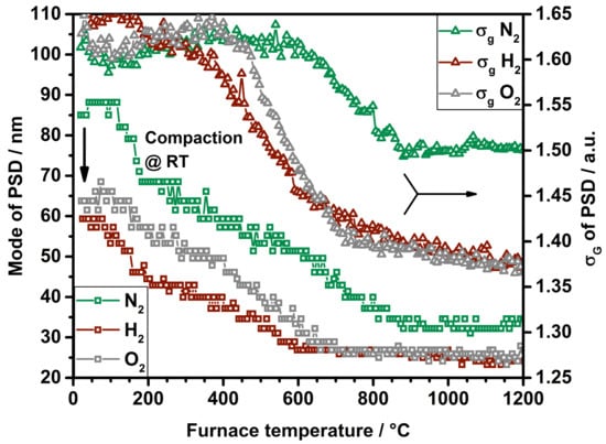 Mode and σg of PSDs for particle sintering in N2, with H2 and with O2