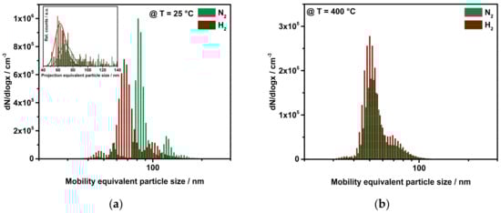 PSD obtained from tandem DMA. (a) A hydrogen gas treatment results in a shift to smaller agglomerates. The inset shows the projection equivalent diameter, acquired by TEM analysis, confirming a compaction. (b) Particles that underwent sintering at 400 °C are assumed to be mechanically reinforced and, therefore, unaffected by reshaping.