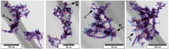 As mentioned for the tandem DMA setup, compacting seems more likely for gas-treated particles than fragmentation. To confirm this hypothesis, TEM micrographs have been produced using finder grids. The following figure (Figure 6) shows four superimposed TEM micrographs. The blue-colored particles correspond to the particles produced under N2 in the SDG. The red-inked particles are the same particles shown in blue that underwent an H2 gas treatment by inserting the finder grid into the TEM sampling unit again with an applied gas flow of 0.2 lpm of 10% H2 in N2 for 15 s.