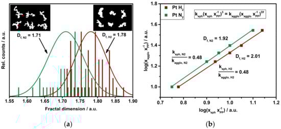 Fractal dimension of platinum particles under nitrogen and after exposure to hydrogen: (a) Df estimation by TEM based on the determination of the radius of gyration. The insert shows binary TEM micrographs used for image analysis by ImageJ®. (b) Log-log plot of pre-classified platinum particles with an agglomerate size of xagglo at room temperature, a primary particle size xPP and spherically sintered particle size xsph at 1150 °C. The slope of the linear fit equals 3/Df. Error bars are within the symbols.