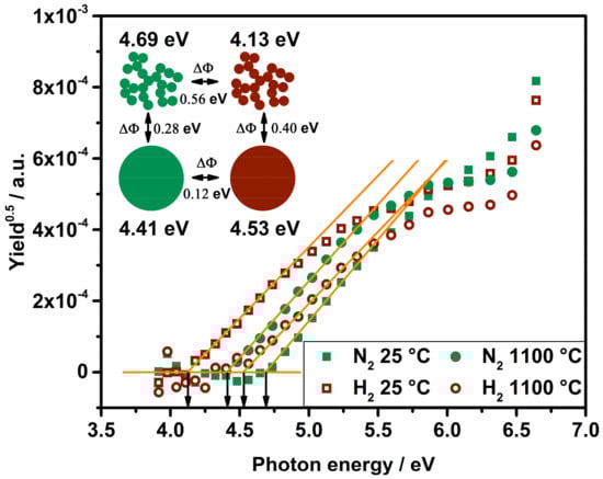 Comparing the respective measurements for nitrogen and hydrogen atmospheres, opposing trends become visible for the change in the eWF. As shown in Figure 8, platinum particles show a shift in eWF from 4.69 eV to 4.13 eV when hydrogen is attached to their surface at room temperature; thus, a reduction in eWF was measured. Apparently, hydrogen causes a decrease in eWF for room temperature particles, while the sintered platinum spheres exhibit an increase in eWF shifting from 4.41 eV to 4.53 eV. It has already been reported that adsorbed hydrogen can cause a decrease in eWF [28,29] but also an increase [29] depending on surface contamination. A sintering process can be seen as a change even for surface contamination, thus opposing trends do not appear contrary to the measured eWFs by APES.