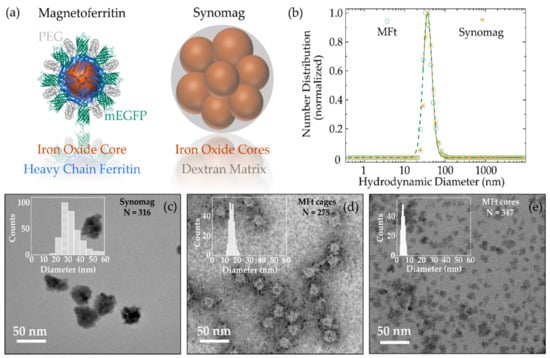 Figure 1. (a) Morphology sketches for magnetoferritin (MFt, parts created with permission of [30]) and synomag nanoparticles (NPs). (b) Number distribution for MFt (green) and PEGylated synomag (yellow) obtained by dynamic light scattering. Transmission electron microscopy images of (c) synomag, (d) MFt protein cages stained with uranyl acetate, and (e) MFt cores unstained. PEG = polyethylene glycol, mEGFP = monomeric enhanced green fluorescent protein, DH = hydrodynamic diameter, N = number of evaluated NPs.