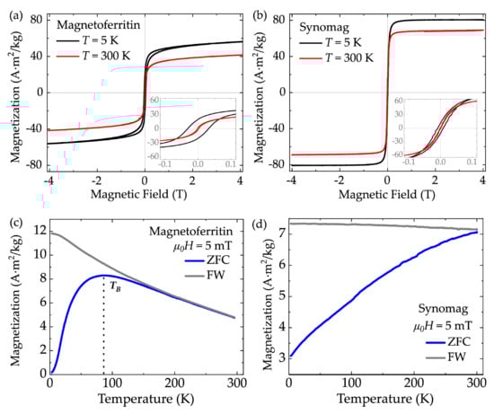 Figure 2. Magnetization as function of magnetic field for (a) magnetoferritin and (b) synomag nanoparticles. ZFC/FW for (c) magnetoferritin and (d) synomag measured in 5 mT. TB = characteristic blocking temperature, ZFC = zero field cooling, FW = field warming.