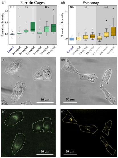 Figure 4. Normalized HeLa WT cellular uptake of (a) ferritin cages and (d) synomag nanoparticles (NH2 surface) as function of concentration. Intensity is given as intensity per pixel inside the cell. Particle systems were transferred into the cells via incubation for 6 or 24 h. (b,c) Phase contrast image and corresponding fluorescent image with cell outlines recorded using 470/525 nm filter for ferritin cages. (e,f) Phase contrast image and corresponding fluorescent image with cell outlines recorded using 545/620 nm filter for synomag NPs. Box plots show the distribution of 100–260 cells recorded in each of five independent measurements per condition.