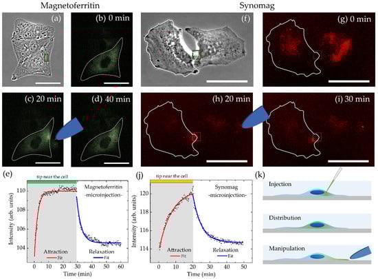 Figure 6. Spatial manipulation of (ad) magnetoferritin and (fi) synomag nanoparticles dispersed inside cytoplasm of living HeLa WT cells after microinjection recorded over 40 min. Scale bars are 50 µm. (e,j) show corresponding mean intensities over time with fit functions to characterize nanoparticle accumulation near the magnetic tip (green box in (a,f)) and relaxation after tip removal. Distance between magnetic tip and analyzed region was (MFt) 6 µm or (synomag) 75 µm, respectively. (k) illustrates the experimental setup for microinjection.