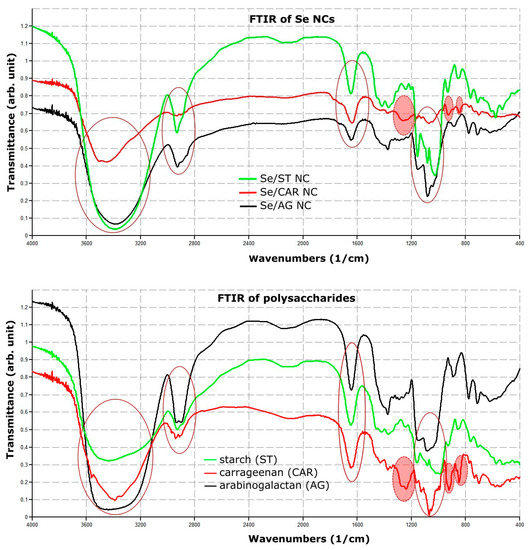 FTIR absorption spectra of all Se NCs and their polysaccharides were largely similar (Figure 1 and Figure S1).