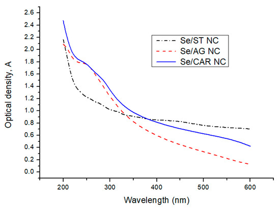 All NCs demonstrated broad decaying optical absorption in the 200–600 nm wavelength range of light (Figure 2). Moreover, there was a prominent absorption region in the range of 225–230 nm for Se/AG NC. In the case of Se/CAR NC, there were three discernible absorption regions in the ranges of 225–260, 260–325, and 500–600 nm. There were also two weakly pronounced regions in the ranges of 250–350 and 400–500 nm for Se/ST NC.