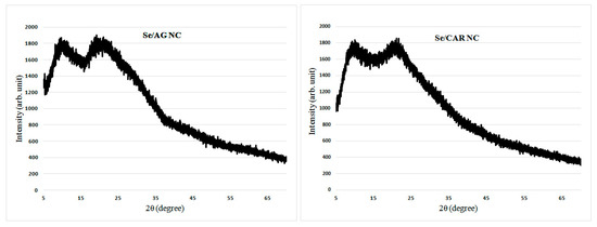 Diffractograms represent XPA spectra and are graphs of the dependence of the scattered radiation intensity on the scattering angle. The diffractograms of Se/AG and Se/CAR NCs were typical with no pronounced reflexes and demonstrated only wide halos from polysaccharide matrices (Figure 3).
