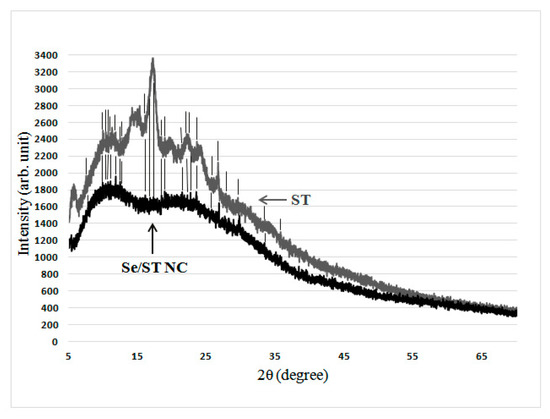 However, in the case of Se/ST NC, its diffractogram still showed weak reflexes, which coincided with a number of reflexes of the original ST used for the synthesis of Se/ST NC (Figure 4, coincidence is marked by vertical lines).