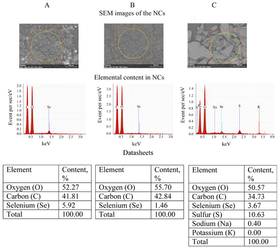 SEM images of NCs powders showed them agglomerated into irregular micrograin structures. While the EDX Se/AG and Se/ST NCs spectra obtained with the SEM microscope contained only X-ray emission lines of carbon, oxygen, and selenium, the EDX spectrum of Se/CAR NC, in addition to the emission of these three elements, also included X-ray emission lines of potassium, sodium, and sulfur. Finally, 3.2 g of Se/AG NC and 4.7 g of Se/CAR NC were obtained as an orange powder containing 5.92% and 3.67% of Se, respectively, according to the EDXMA (Figure 5). Regarding Se/ST NC, 1.9 g were received in total in the form of a pale gray powder containing 1.46% of Se according to the EDXMA (calculated approximately by considering a negligible contribution of the lightest hydrogen to the total percentage of elements, which cannot be detected by the EDXMA method).