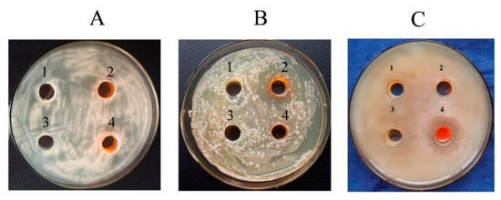 Effect of the Se NCs on the growth of rhizosphere bacteria (with 105.57 µg/mL for Se/AG NC, 428.08 µg/mL for Se/ST NC, and 170.30 µg/mL for Se/CAR NC, which corresponds to the Se concentration of 6.25 µg/mL in the final solution): (A) R. erythropolis, (B) A. guillouiae, (C) P. oryzihabitans. 1—control, 2—Se/AG NC, 3—Se/ST NC, 4—Se/CAR NC.