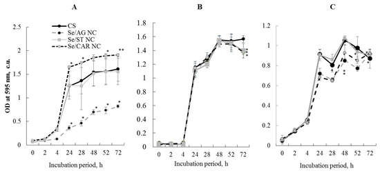 Effect of the Se NC treatments (with 105.57 µg/mL for Se/AG NC, 428.08 µg/mL for Se/ST NC, and 170.30 µg/mL for Se/CAR NC, which corresponds to the Se concentration of 6.25 µg/mL in the final solution) on the growth dynamics of rhizosphere bacteria A. guillouiae (A), R. erythropolis (B), and P. oryzihabitans (C). CS—control samples; * p < 0.01, ** p < 0.05 (in comparison with CS at each respective time point) based on 9 independent observations per each Se NC, control and bacteria.