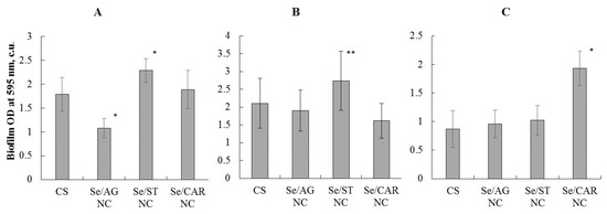 The concentration of all Se NCs used to study their anti-biofilm formation effect corresponded to the Se concentration of 6.25 µg/mL in the final solution. The Se/AG NC (with a concentration of 105.57 µg/mL) significantly reduced the biofilm formation of the bacterium A. guillouiae by 30% compared to the control (Figure 9A). It did not affect the other studied bacteria significantly. No negative effect of Se/ST NC (with concentration of 428.08 µg/mL) on the biofilm formation of rhizosphere bacteria was revealed (Figure 9), it even stimulated the biofilm formation of A. guillouiae and R. erythropolis (Figure 9A,B). No effect of Se/CAR NC (with concentration of 170.30 µg/mL) on the biofilm formation under study was found in A. guillouiae and R. erythropolis. This NC even stimulated the formation of biofilms in P. oryzihabitans (Figure 9C).