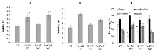 Two weeks before planting, tubers of potato variety “Sante”, zoned in the region where the study was carried out, were sprayed with an aqueous Se NC suspension with the following concentrations: 105.57 µg/mL for Se/AG NC, 428.08 µg/mL for Se/ST NC, and 170.30 µg/mL for Se/CAR NC, which corresponds to the Se concentration of 6.25 µg/mL in each NCs in the final solution. Control tubers were sprayed with water. Seed material of all variants was planted in the soil on the field of the experimental plot of the Siberian Institute of Plant Physiology and Biochemistry, Siberian Branch of the Russian Academy of Sciences, (Irkutsk, Russia). Each experimental group contained 30 plants planted in three different plots. The experiment lasted 90 days. The cultivation of plants was carried out with periodic weeding and hilling without additional watering and fertilization, in the extreme continental climate of Eastern Siberia (Irkutsk, Russia). At the end of the growing season, the productivity was assessed for pooled tubers from all 30 plants per plot, and the analysis of the structure of the potato yield was carried out using the nonparametric Mann–Whitney U test. We did not measure the selenium content in tubers treated with NCs, because these tubers were not intended to be used for human or animal consumption, but as planting material. Therefore, we were mainly interested in a long-term effect of exposure to seed material, which could manifest itself during the growing season and affect productivity.