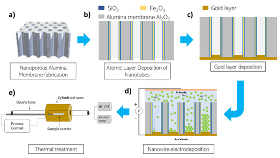 Scheme of the additive fabrication process process to obtain SiO2/Fe2O3/SiO2/FeCo core/shell nanotubes/nanowires, and further thermal treatment for Fe2O3 (hematite) reduction into Fe3O4 (magnetite). (a) Nanoporous alumina template, (b) deposition of nanotubes shell by ALD, (c) gold contact layer deposition by sputtering, (d) electrochemical deposition of metallic nanowire core, (e) thermal annealing under reducing atmosphere.