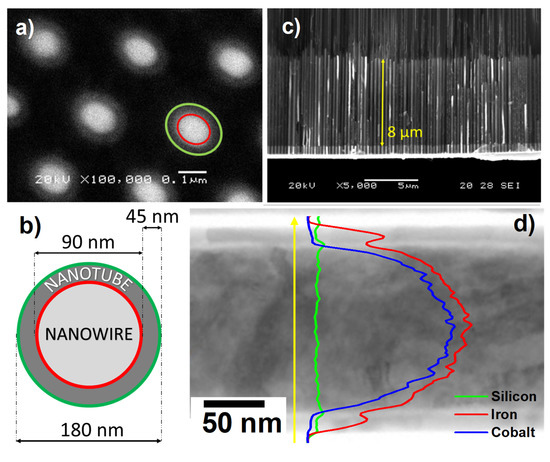 Cylindrical coaxial nanostructures can exhibit novel phenomena due to their unique size- and shape-dependent physico-chemical properties, as compared to their bulk counterparts, making them enormously attractive as innovative multifunctional materials, for both fundamental and technological applications, such as photonics, drug delivery, and cell separation for proteomics research, hierarchical core/shell heterostructured electrodes for high-performance Li-ion batteries, or highly anisotropic ferromagnetic-antiferromagnetic core/shell nanomaterials exhibiting tunable magnetic properties [1,2,3,4]. These peculiar, elongated hybrid nanostructures are coaxially combining two or more components with several phases of distinct properties that could originate additional effects compared with single-phase nanomaterials, which outfit them with enhanced multifunctional properties. For example, core/shell ferromagnetic nanowires (NWs) and nanotubes (NTs) comprising hybrid metallic/non-metallic core and shell materials usually offer the specific advantages of mixed properties by combining both contributions to convey with tailored multifunctional capabilities, such as the high magnetization and magnetic anisotropy values present in transition metals (TM = Fe, Ni, Co, and their alloys), with the outstanding biocompatibility and enhanced chemical stability exhibited by oxide layers (SiO2, TiO2, Fe3O4, NiO, CoO, etc.) [5,6,7,8].