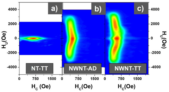 In order to further expand this concept, we rely on the more complex FORC methodology by obtaining the FORC distributions of the samples at 300 K, all of them measured by applying the magnetic field parallel to the nanowires/nanotubes long axis. The FORC distributions for all three samples are collected in Figure 5. Figure 5 (left panel) represents the FORC distribution corresponding to the NT-TT sample which denotes a single distribution along the coercivity axis, Hc, thus indicating a weakly interacting system as it was also inferred from the corresponding hysteresis loop, where the wide FORC distribution indicates the broad switching field values of each NT. In contrast to the previous one, the FORC distribution for the NWNT-AD sample, shown in Figure 5 (middle panel), displays an elongated distribution along the interaction axis, Hu, which indicates a strongly interacting system where each FeCo nanowire influences the magnetic state of its neighbors. Finally, in Figure 5 (right panel) the NWNT-TT FORC distribution displays a quite similar elongated distribution along the Hu axis to the NWNT-AD, but there are visible differences in the shape of the distribution. Although apparently, it could resemble the linear superposition of the two previous FORC distributions, i.e., direct superposition of contributions from NWs and NTs, a deeper look into it suggests otherwise. Instead of a FORC diagram comprising the superposition of two independent FORC distributions, it looks that the central distribution along Hu = 0, which is in a first instance ascribed to the magnetite nanotubes, shifts the whole magnetization reversal processes of the FeCo nanowires to higher and lower values of the interaction field. This could be explained by considering that the magnetization reversal of the nanotubes, which occurs completely at a certain value of the applied field, introduces a jump or an offset in the effective magnetic field that affects the whole sample and thus to the nanowires.