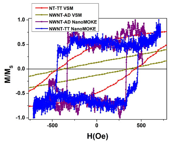 From the axial hysteresis loops plotted in Figure 4, we can extract a basic idea regarding the magnetic events that take place in each system [50]. By analyzing the slope of the histeretic curves, one can deduce that the NT-TT sample, which only contains the magnetite nanotubes, is a magnetic system where the individual elements which constitute the sample do not magnetically interact so much among them, as its hysteresis loop appears to be straight and relatively parallel to the vertical axis. However, for the NWNT-AD sample, which only contains the Fe56Co44 ferromagnetic nanowires, the loop displays a sharper slope than the NT-TT one. This fact indicates that the magnetic elements involved in the system are magnetostatically interacting with each other to a higher degree than in the previous sample. Therefore, the switching fields needed to reverse the magnetization of the magnetic elements of the NWNT-AD sample are altered, making the switching happen at a lower or higher field value (depending on each individual element) than those required to switch them when they are isolated by separately. Lastly, the NWNT-TT sample, which is composed of the core/shell bimagnetic nanostructures, shows an even gentler and steeper slope than the nanowires sample (NWNT-AD), indicating that the two magnetic elements of the core/shell sample turn into even much more interacting between them after the magnetite nanotubes have been added to the system. The individual magnetic elements of the sample are switching their magnetization state at even lower or higher external field values due to the more intense neighboring magnetic field.