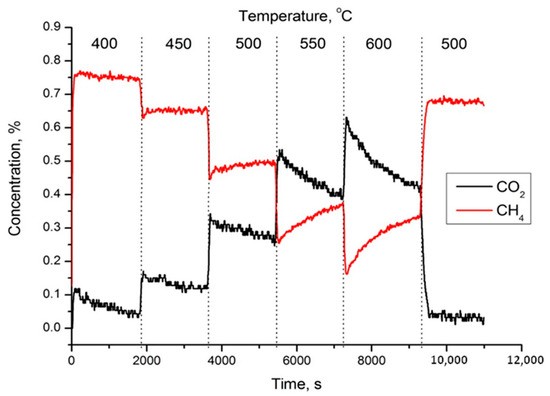 Methane complete oxidation reaction was carried out in a tubular quartz plug flow reactor using a feed of 1% CH4 + 10% O2 + N2 balance at 400–600 °C and a contact time of 0.1 ms. The weight of the powder fraction of 0.25–0.5 mm was 50 mg. Analysis of the reaction mixture was carried out using a gas analyzer equipped with IR sensors for CO, CO2, and CH4 (Boner LLC, Novosibirsk, Russia).