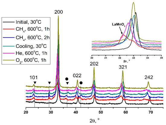 To study the process of sample deactivation, high temperature XRD experiments were performed simulating the reaction conditions in the diffractometer chamber. Figure 2 shows XRD patterns of the sample in the different states. According to XRD data, the sample in the initial state was a single-phase perovskite of orthorhombic modification (sp.gr. Pnma, JCPDS # 46-513) [34]. When the reaction mixture was fed into the diffractometer chamber, a jump-like increase in the volume of a part of the perovskite occurred with the formation of a phase with cell parameters close to LaMnO3 (sp.gr. Pnma, JCPDS # 87-2012) and the simultaneous segregation of CaCO3 (sp.gr. R-3c, JCPDS # 5-586), CoO (sp.gr. Fm-3m, JCPDS # 48-1719), and Co3O4 (sp.gr. Fd-3m, JCPDS # 42-1467) particles on the surface of the perovskite phase. It is important to note that the phase observed during the reaction is close in lattice parameters to LaMnO3, but it may contain calcium and cobalt cations in its composition. A selected fragment of Figure 2 shows the difference between the initial and processed perovskite, showing a significant shift of the 200 reflex on the XRD pattern (2θ ~ 33°). Heating to a temperature of 600 °C leads to a significant broadening of reflexes, especially in the area of distant angles. The intensity of reflexes in the areas of 2θ = 50–70° significantly decreased. It can be assumed that the initial effect of the reaction medium on the perovskite structure leads to the decomposition of the solid solution and the formation of a new intermediate structure.