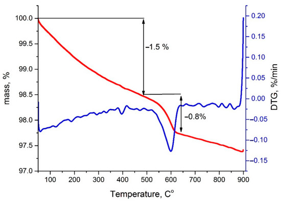 The TG (Figure 4) curve shows that the sample loses mass in three stages during heating in He flow. The first 1.5% mass change occurs in the range from 50 to 480 °C and can be associated with the desorption processes from the sample surface. From 480 to 650 °C, there is a rapid mass loss of −0.8%. As follows from the DTG curve, the highest rate of mass loss occurs in the region of 600 °C. In the temperature range of 650 to 900 °C, the sample mass decreases by 0.3%.