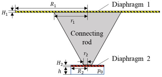 where R2 and H2 are the radius and the thickness of diaphragm 1, respectively; r2 is the radius of the lower endface of the connecting rod; E2 and μ2 are Young’s modulus and Poisson’s ratio of the diaphragm material.