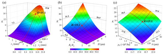 Simulation on (a) the effect of the radius r1 and r2 of the connecting rod on K, (b) the effect of the ratio of radius R1/R2 and the thickness H of two diaphragms, and (c) the effect of the height h and the initial pressure p0 of cavity 2 on K.